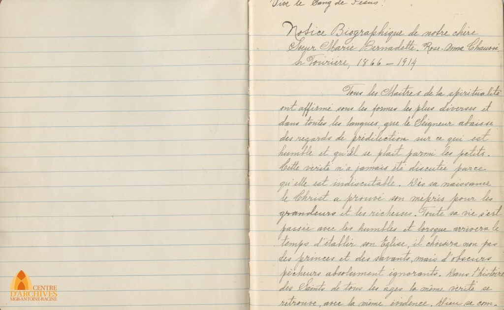 Sœur Marie Bernadette, ou Rose-Anna Chaussé dans la vie civile, est née le 22 décembre 1866 à Saint-Guillaume d’Upton. La chroniqueuse retrace l’enfance de Rose-Anna et ses prédispositions à la vie religieuse et de sa découverte de la communauté des Adoratrices du Précieux-Sang grâce à sa cousine Aurise Doyon. Lorsque la jeune fille se présente au Monastère de Trois-Rivières, cette dernière est vivement impressionnée par la communauté et demande à ce moment d’y entrer. Alors âgée de 24 ans, elle entre au couvent le 27 juin 1890 et devient la première sœur tourière du monastère. La sœur tourière est celle qui est chargée des relations avec l’extérieur dans une communauté cloîtrée. Elle a, pour ainsi dire, un pied dans le monde matériel et un autre dans le monde spirituel. Elle décède malheureusement en 1914, à l’âge de 48 ans.