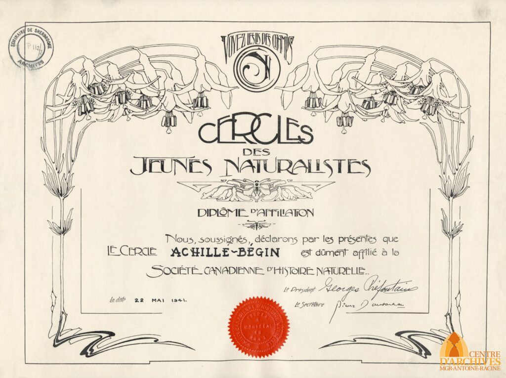 [3] Certificat d’affiliation du Cercle Achille Bégin à la Société canadienne d’histoire naturelle, 1941, P112/2.