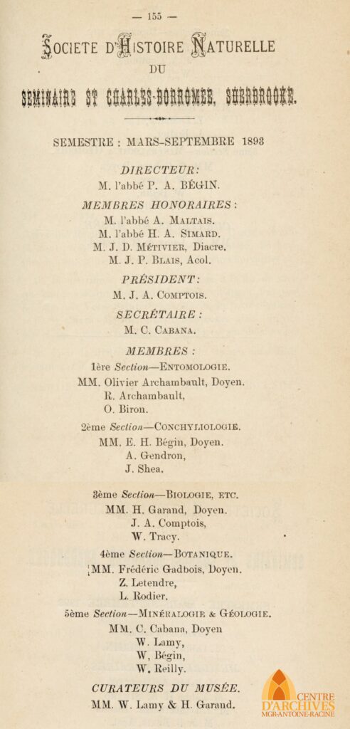 La société d’histoire naturelle est arrivée au Séminaire en mars 1893. C’est l’abbé Pierre-Achille Bégin qui en est le fondateur. Selon ce dernier, le but de la société était de propager et de vulgariser l’étude des sciences naturelles tout en augmentant les collections du musée de leur alma mater[1]. La société d’histoire naturelle s’organisait de mars à septembre pour toutes les années, mais pour la deuxième et troisième année d’existence il y avait aussi un semestre de septembre à mars. Chaque semestre, un président et un secrétaire étaient élus parmi les étudiants participants. Ils étaient aussi divisés en différentes sections, qui annonçaient leur préoccupation première. Chaque section se voyait donc attribuer une branche des sciences naturelles. La première section était l’entomologie, la seconde la conchyliologie, la troisième la biologie, la quatrième la botanique et la cinquième la minéralogie et la géologie.